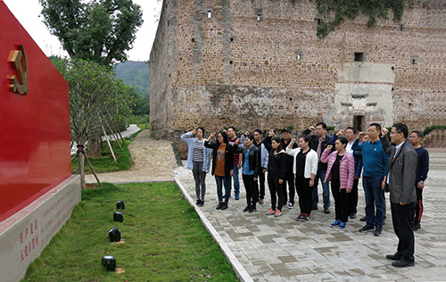 “红围”建于清朝道光年间,原是始兴县沈所镇的一座客家围楼。1938年10月21日广州沦陷,粤北重镇韶关成为临时省会,中共广东省委机关也由广州迁至韶关,领导华南的敌后抗战。由于抗战形式严峻,1940年7月至1941年省委机关迁至始兴红围。在白色恐怖、腥风血雨的日子里,原广东省委在红围克服了许多困难,组织开展一系列重大活动,做出过许多重大决策。红围在中共广东史上写下光辉的一页。 全体党员通过讲解和图解,瞻仰革命遗址、重走红色路线,对当年中共广东省委艰苦卓绝的斗争历程有了深入的了解和感受,更坚定了继承和发扬革命先辈的光荣传统和优良作风的理想信念,决心将红色基因一代一代传承下去。 活动中,在王克书记的带领下,全体党员面对庄严的党旗,重温入党誓词,表达了对党的忠诚和为党的事业而奋斗的决心。