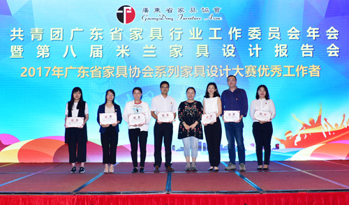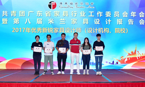 为推动家具行业设计创新工作、提高家具设计师对行业的积极性及归属感。报告会上,广东省聚智家居创新中心、 对华南农业大学张笑影等9名设计机构、院校设计师颁发“2017年优秀新锐家具设计师”证书。同时,对2017年 系列家具设计大赛(包括:红古轩杯、荷花杯、丽江杯、健威杯、百利杯、志达杯、宜华杯)的优秀工作者进行表彰。