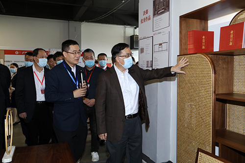 去年,全省推动制造业高质量发展大会明确提出,要实施“六大工程”(强核、立柱、强链、优化布局、品质、培土),坚定不移推动制造业高质量发展。工业和信息化部等十三部门印发的《制造业设计能力提升专项行动计划(2019-2022年)》提出,要提升传统优势行业设计水平,运用新材料、新技术、新工艺,在轻工纺织等具有一定比较优势的产业,实现设计优化和提升,推动传统产业转型升级。 王克会长表示,今后省家具协会将坚持设计为导向,把握“创新驱动、技术改造、环境治理、优化升级”的行业指导思想,以每两年一届的“省长杯”工业设计大赛为契机,不断凝聚我省乃至全国的家具设计力量,为提升我省家具行业的设计水平,为促进家具行业高质量发展,为人民对美好生活的追求作出积极贡献。设计创新,我们一直在路上! 省工信厅二级巡视员叶元龄、生产服务业与交流合作处处长孟辉、一级调研员曾海燕,新华影视董事长黄泾炜,省工业设计协会秘书长周红石、省家具协会副会长兼秘书长张承志等陪同参观。