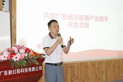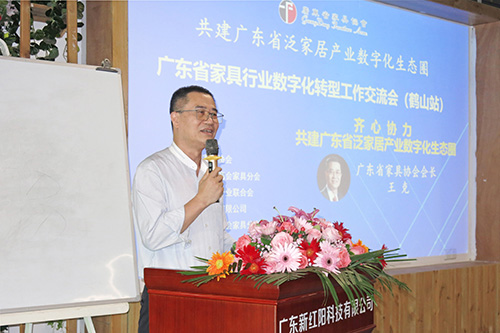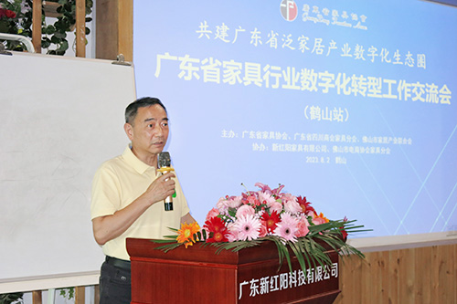 广东新红阳科技有限公司董事总经理朱玉山在致辞中表示,数字化转型是广东家具业实现高质量发展的必然要求。新红阳公司一直致力于家具行业的数字化转型,在致力于打造大湾区数字化智能家具产业园等方面,进行了大量探索和积极实践,也取得了一些成效。期待在本次交流会后,能与省家具协会及与会者保持密切合作,共同推动广东家具企业的数字化转型。